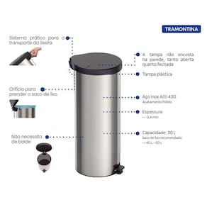 Lixeira Inox Com Pedal New Tramontina Com Acabamento Polido 30 L Tramontina Lixeira Inox com Pedal New Tramontina com Acabamento Polido 30 L Tramontina - Para manter a organização e a limpeza da sua casa, sem abrir mão da beleza e do estilo, conte com a lixeira Tramontina New em aço inox 30 litros. Desenvolvida com um design especial, ela tem corpo produzido em aço inox e tampa em polipropileno preto, características que a tornam uma lixeira versátil e ideal para os ambientes mais variados. Ela ainda é muito prática, tem alça para transporte e não necessita de balde, basta inserir o saco plástico e prender na sua lateral. Sua tampa não encosta na parede no momento da abertura, o que evita marcas e eventual desgaste. Escolha Tramontina e garanta ambientes muito mais versáteis e agradáveis! Características Gerais do Produto: Garantia: - 1 Ano