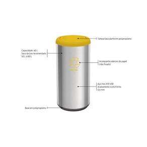 A Lixeira Inox Tramontina Cápsula Selecta Plus Basculante com Acabamento Scotch Brite e Tampa Basculante Amarela em Polipropileno 40 L, é um produto ideal para ambientes domésticos, comerciais ou de grande circulação de pessoas , escolas, restaurantes, supermercados, shopping centers e outros, possibilitando a separação correta do lixo. Além disso tudo, vem com um adesivo amarelo que indica o descarte de metal. Com ela, você deixa seu ambiente pronto para todo mundo colaborar com a organização e a coleta seletiva, ajudando o meio ambiente.