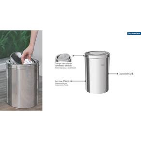 Lixeira Inox Tramontina Swing com Acabamento Polido e Tampa Basculante 12 L Perfeita para qualquer ambiente, a Lixeira Inox Tramontina Swing com Acabamento Polido e Tampa Basculante 12 L, combina sofisticação e estilo. Com a qualidade dos produtos fabricados no Brasil, é produzida em aço inox com acabamento polido. Portátil, possui tampa basculante que facilita o uso e capacidade de 12 L. Informações Gerais Material: Aço Inox AISI 430 Espessura: 0,4 mm Acabamento: Polido Tratamento anti digitais: Não Alça para transporte: Não Tampa: Sim, basculante Balde plástico removível: Não Capacidade: 12 L Saco de lixo recomendado: 15 - 20 L Recomendações de Uso Produto para uso interno. Para a limpeza, lavar com uma esponja macia e detergente neutro. Nunca deixar objetos metálicos por muito tempo em contato com a lixeira, para evitar a corrosão. Evitar o contato com ácido muriático, água sanitária ou qualquer outro solvente que possa vir a agredir o produto. Para manter o brilho da sua lixeira, recomendamos o uso da pasta para polir e remover manchas em superfícies de aço inoxidável "Tramontina".
