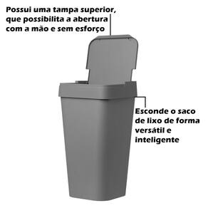 DESCRIÇÃO DO PRODUTO: A Lixeira Izy 15 Litros é perfeita para quem procura funcionalidade e beleza para a sua casa, pois permite a organização de forma versátil além de otimizar o espaço do ambiente. O produto possui uma tampa superior, que possibilita a abertura com a mão e sem esforço. Ao abrir com a mão, a tampa permanece aberta para facilitar a troca do saco de lixo. O cuidando com a beleza da sua casa fica claro com a sua tampa especial que não deixa o saquinho de lixo exposto na parte externa da lixeira, além do aro ser removível facilitando a troca de sacos e limpeza. Fabricada em material resistente e flexível (Polipropileno), além do plástico ser texturizado impedindo riscos e facilitando a higiene. Praticidade, cuidado com a higiene e design são as características da linha de Lixeiras pensadas para proporcionar qualidade na organização de qualquer ambiente.