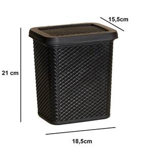 As dimensões dessa lixeira são as seguintes: - Altura: 21 cm - Largura: 15,5 cm - Profundidade: 18,5 cm