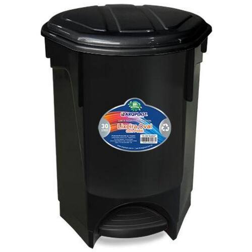 Lixeira Multiuso Oval Com Pedal e Tampa 30 litros Preta Descrição: Com capacidade de 30 litros, esta lixeira de plástico preto é acionada por pedal, ideal para cozinhas e banheiros.
