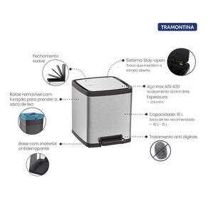 Para manter seus ambientes limpos, organizados e com muito estilo, a lixeira Tramontina Octos é um item indispensável. Desenvolvida para levar praticidade e modernidade para sua cozinha, ela é produzida em aço inox com capacidade de 10 litros e conta com tratamento especial anti digital, que não deixa marcas de manuseio no corpo da lixeira. Seu balde é de plástico removível e possui furação para prender o saco plástico, além de uma trava na tampa para mantê-la aberta, e tudo isso, para garantir praticidade para sua rotina. Além de todas essas características, a lixeira Octos tem fechamento suave da tampa, pedal e pés antiderrapantes. Uma lixeira para pessoas exigentes e que não abrem mão da alta qualidade em todos os ambientes