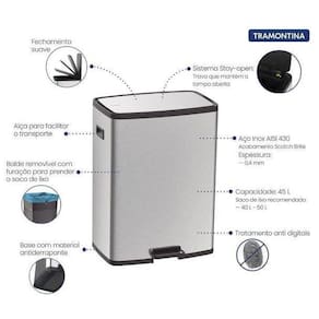 Lixeira Octos Inox Balde Removível e Pedal 45L TramontinaPara manter seus espaços cheios de estilo e organizados, é essencial contar com itens como a lixeira Tramontina Octos de 45 litros, produzida em aço inox com balde de plástico removível. Perfeita para ambientes com alta demanda, seu corpo conta com tratamento anti digital que evita marcas de manuseio no produto e sua tampa possui trava para facilitar a troca do saco plástico. A lixeira Octos ainda possui pés antiderrapantes e fechamento suave da tampa, características que facilitam seu dia a dia e garantem maior durabilidade do produto.Componentes incluídos na embalagem:Código: 9454444501- Lixeira Octos 45L Material: Aço Inox AISI 430 Espessura: 0,4 mm Medidas: A 930mm L 485mm P 370mm Acabamento: Scotch Brite Tratamento anti digitais: Sim Alça para transporte: Sim Abertura: Pedal Tampa: Sim, com sistema Stay Open Fechamento suave da tampa: Sim Balde plástico removível: Sim Capacidade: 45 L Saco de lixo recomendado: 40 - 50 L Todas as imagens são meramente ilustrativas.