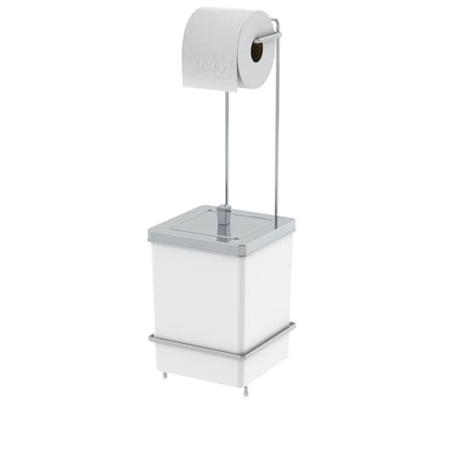 Especificações - Medidas: 59.5cm (altura) x 19,5cm (largura) x 19cm (profundidade) -Peso: 1,286 kg - Matéria-prima: Aço Carbono + Plástico - Cor/Acabamento: Cromado + Branco - Capacidade: Suporte para 1 rolo de papel higiênico e 1 Lixeira de 6,5 litros - Linha: Perfezione