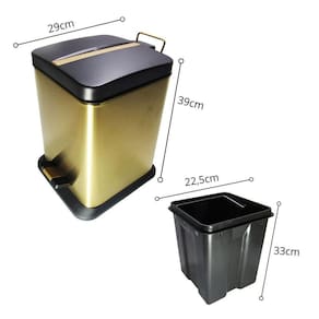Lixeira Quadrada Dourada e Preta em Aço Inox Com Pedal 12L - By Fineza Material Aço Inox e polipropileno plástico Dimensões do produto Lixeira A39xL29cm Balde interno removível A33xL22,5cm Capacidade 12L Peso aproximado da embalagem com produto - 2kg Revestimento Nitreto de Titânio Dourado - Não é pintura. Descrição Uma lixeira quadrada dourada e preta em aço inox com pedal, com capacidade para 12L, acabamento externo e interno emborrachado, com um balde interno removível e revestimento PVD DOURADO de alta durabilidade. Um acessório para banheiro que é portátil e prático. Agrega beleza e funcionalidade aos ambientes, pois possui um acabamento em alto brilho metálico, sem porosidades que evita o acumulo de resíduos. É higiênica e durável. Peça em aço inox de alto padrão. Para abrir basta pressionar o pedal localizado na parte inferior da lixeira. Dica Além de ser uma lixeira portátil e prática para se usar no banheiro, ela também pode ser funcional na sua cozinha, escritórios ou salas comerciais. Importante Esse produto não oxida, não enferruja e nem mancha o piso ou bancada com o passar do tempo desde que as recomendações de uso sejam seguidas adequadamente . Produto altamente resistente a umidade. Contém 01 lixeira quadrada com pedal 01 balde removível 12L Recomendações de uso Use apenas sabão ou detergente e o lado macio da esponja. Outros tipos de produtos, como palha de aço, poderão riscar ou prejudicar o brilho. Enxágue bem cada peça a fim de remover totalmente os resíduos dos produtos de limpeza, que, por serem abrasivos, podem prejudicar o inox. Sempre que possível, use água morna, pois renova o brilho do produto. Após a lavagem, enxugue imediatamente o mesmo, caso contrário, as substâncias químicas da água cloro poderão causar manchas. Na lavagem manual evite atrito entre o produto durante o processo de lavagem e no armazenamento, para mantê-los sem riscos. Não recomendado também, o uso de máquina lava louças. Marca: Não Informado Ean: 7893590634990