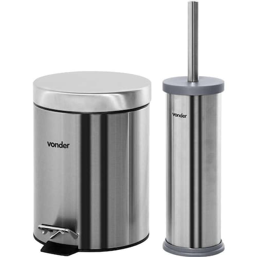 Fabricada em aço inox 410. Possui balde plástico removível com alça e abertura da tampa por pedal, com sistema de amortecimento. Conta ainda com escova sanitária e suporte em aço inox 410 com tampa.