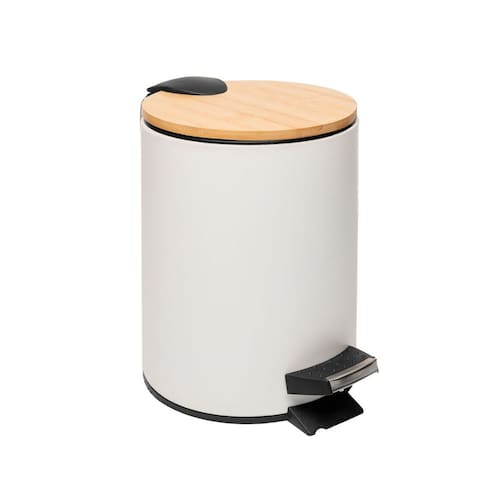 1 Lixeira Redonda de Metal com Pedal e Tampa em Bambu Branca 3L 220223 - Lyor