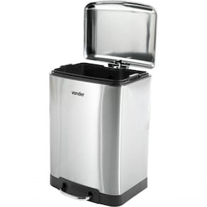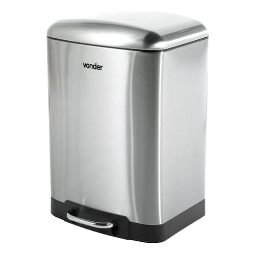 Fabricada em aço inox 410. Possui bandeja plástica, alça plástica e abertura da tampa por pedal com sistema de amortecimento.