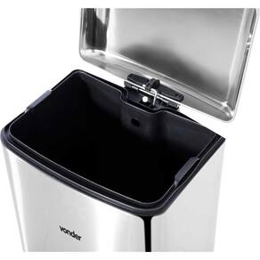 Lixeira retangular 30 litros inox cinza VONDER Fabricada em aço inox, maior resistência e durabilidade. Possui balde plástico removível com alça e abertura da tampa por pedal, com sistema de amortecimento. Possui base emborrachada, evitando que a lixeira se mova quando é acionada. Conteúdo: 1 Lixeira. Capacidade: 30 litros | Formato: Retangular | Tipo de tampa: Inox, abertura por pedal | Dimensões: Largura: 345 mm / Profundidade: 325 mm / Altura: 620 mm | Cor da lixeira: Cinza (Inox) | Material (tipo/composição): Aço Inox 410 | Massa aproximada (peso) (kg): 3,85 kg