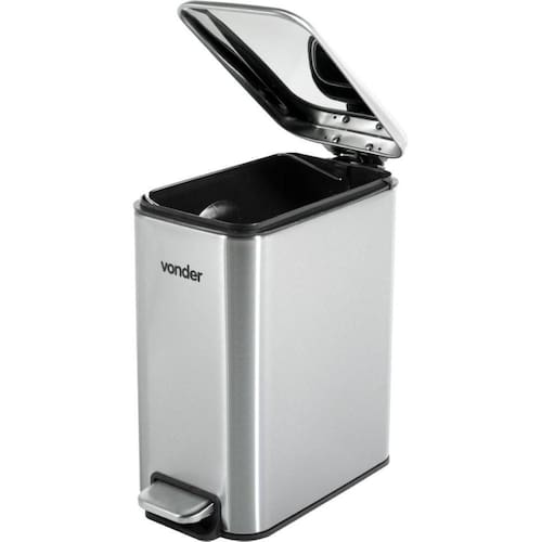 Fabricada em aço inox 410. Possui bandeja plástica, alça metálica em aço inox 410 e abertura da tampa por pedal com sistema de amortecimento.