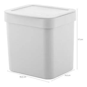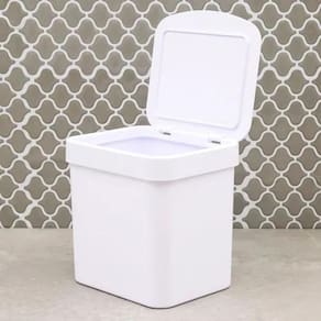 Dimensões da Lixeira: 16,5cm C x 14,5cm L x 17cm A Altura da lixeira com tampa aberta: 30,5cm Dimensões do Suporte: 7,3cm C x 2cm L x 7,3cm A Capacidade da Lixeira: 2,5 Litros Com Suporte de Fixação para Parede Acompanha: 2 buchas e 2 parafusos.
