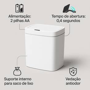 Lixeira Tampa Abertura Inteligente Slim Plástico Capacidade de 15 Litros Para Cozinha Banheiro Escritório Cor: branco Transforme sua rotina com a Lixeira Automática com Sensor de 15 Litros. Com tecnologia de detecção de movimento, a tampa abre automaticamente, garantindo higiene e praticidade no dia a dia. Seu design moderno e minimalista em plástico ABS de alta resistência está disponível em três elegantes cores: branco, preto e cinza escuro. O sistema de vedação evita a propagação de odores, mantendo o ambiente sempre agradável. A abertura suave e o fechamento em apenas 0,4 segundos oferecem total conforto, enquanto o suporte interno facilita a troca dos sacos de lixo. Ideal para cozinhas, banheiros, escritórios e quartos, a Lixeira Automática é alimentada por 2 pilhas AA não inclusas , com longa duração e funcionamento silencioso. Compacta e eficiente, traz um toque inteligente para sua casa ou escritório. Benefícios: Sensor de movimento inteligente: tampa abre automaticamente. Vedação anti-odor. Fechamento rápido e silencioso 0,4s . Suporte interno para fixação do saco de lixo. Design compacto e moderno em ABS de alta qualidade. Três opções de cores: branco, preto e cinza escuro. Especificações Técnicas: Capacidade: 15 Litros Dimensões: 31cm A x 26cm L x 18,5cm P Alimentação: 2 pilhas AA Material: Plástico ABS Dicas de Uso e Conservação: Utilize em ambientes internos. Limpeza com pano úmido e detergente neutro. Evitar contato com líquidos diretamente na tampa eletrônica. e Segurança: de 90 dias contra defeitos de fabricação. Adquira agora e traga praticidade, higiene e sofisticação para sua casa