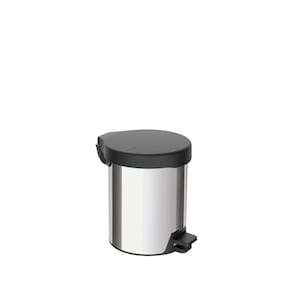 Material (corpo): aço inox aisi 430 Material (tampa, pedal e base): plástico preto Espessura: 0,4 mm Acabamento: polido Tratamento antidigitais: não Pegador para transporte: sim Abertura: pedal Tampa: sim Fechamento suave da tampa: não Balde plástico: não Capacidade: 5 l Saco de lixo recomendado: 10 - 15 l