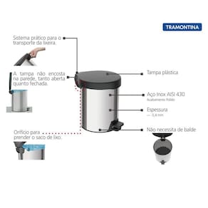 Lixeira tramontina inox c/pedal new 5l Lixeira com pedal new tramontina em aço inox com acabamento polido 5l Cód. 94538705 Que tal uma lixeira diferente para a sua casa Com mix de materiais e garantia de qualidade e resistência, a lixeira de pedal new 5l da tramontina é fabricada com corpo em aço inox e tampa plástica. Com capacidade de 5l ela não necessita de balde plástico, podendo utilizar somente o saco de lixo de 10 - 15 l que fica preso pelo orifício lateral da lixeira. Ao fechar a tampa, o saco de lixo não aparece, mantendo a estética do produto. A lixeira é durável, resistindo a mais de 1 milhão de ciclos abertura e fechamento . Outro diferencial é que a tampa não bate na parede quando aberta. Informações gerais Material corpo : aço inox aisi 430 Material tampa, pedal e base : plástico preto Espessura: 0,4 mm Acabamento: polido Tratamento antidigitais: não Pegador para transporte: sim Abertura: pedal Tampa: sim Fechamento suave da tampa: não Balde plástico: não Capacidade: 5 l Saco de lixo recomendado: 10 - 15 l Recomendações de uso Produto para uso interno. Esta peça contém bordas cortantes. Manusear com cuidado. Para a limpeza, lavar com uma esponja macia e detergente neutro. Nunca deixar objetos metálicos por muito tempo em contato com a lixeira, para evitar a corrosão. Evitar o contato com ácido muriático, água sanitária ou qualquer outro solvente que possa vir a agredir o produto. Para manter o brilho da sua lixeira, recomenda-se o uso da luva de microfibra para limpar aço inox tramontina referência 94537/004. Peso 0,80 kg Capacidade 5.00 l Imagens meramente ilustrativas