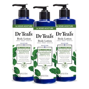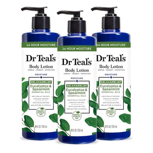 Loção corporal Dr Teal's, óleos essenciais e eucalipto, hortelã e óleos essenciais, 18 fl oz (pacote com 3) — INGREDIENTES HIDRATANTES: manteiga de cacau e manteiga de karité hidratam profundamente a pele — 24 horas de hidratação: desfrute de um dia inteiro de hidratação intensa — PERFUME DE EUCALIPTO E HORTELÃ: Inspire uma refrescante hortelã e hortelã — COM VITAMINA E: A vitamina E ajuda a proteger a pele — RITUAL DE AUTOCUIDADO: Um ótimo complemento para sua rotina diária de autocuidado - SEM INGREDIENTES AGRESSIVOS: sem parabenos e ftalatos - LIVRE DE CRUELDADE: fórmula vegana e nunca testada em animais