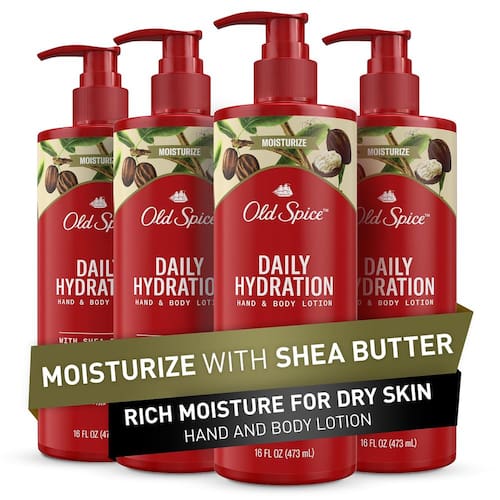 - A loção de hidratação diária para mãos e corpo Old Spice com manteiga de karité fornece hidratação da pele durante todo o dia