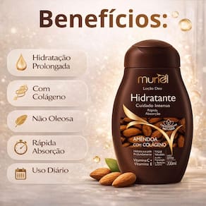 Descubra o segredo para uma pele profundamente hidratada e com um toque irresistível com a Loção Deo Hidratante Muriel Amêndoa Com Colágeno 200ml. Este creme hidratante desodorante é a escolha perfeita para quem busca unir hidratação suave, ação desodorante e uma fragrância delicada de amêndoas em um único produto. Desenvolvida para todos os tipos de pele, especialmente as que sofrem com ressecamento, esta loção transforma sua rotina de cuidados em um momento de puro prazer, deixando sua pele macia, firme e com uma sensação de frescor prolongado. Ideal para quem busca uma pele nutrida e com um perfume suave, esta loção é a aliada perfeita para o seu dia a dia.