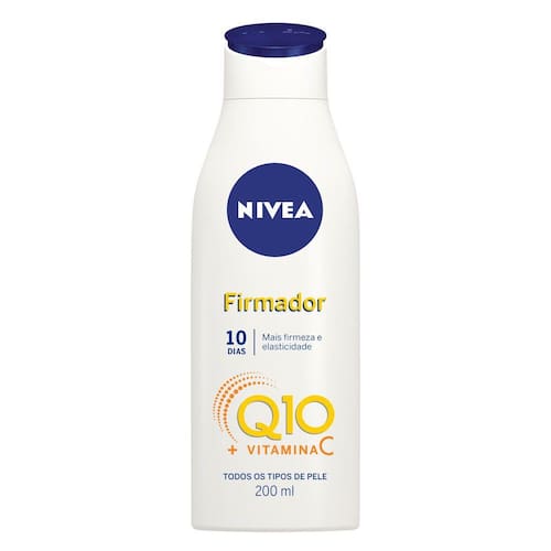 Loção Hidratante Corporal Firmador Nivea Q10 +Vitamina C 200mL - Fórmula enriquecida com dois poderosos antioxidantes, Q10 e Vitamina C, que combatem os radicais livres, melhora visivelmente a firmeza e a elasticidade da pele em apenas 10 dias, além de prevenir a flacidez e hidratar a pele intensamente por 48 horas.