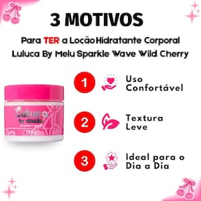 Benefícios PrincipaisA Loção Hidratante Corporal Luluca By Melu Sparkle Wave Wild Cherry é perfeita para integrar sua rotina diária de cuidados com a pele. Use-a após o banho para selar a hidratação, antes de sair para um evento especial para garantir uma pele macia e perfumada, ou sempre que sentir necessidade de um toque extra de cuidado e bem-estar. Sua fragrância vibrante e alegre a torna ideal para momentos em que você deseja se sentir revigorada e confiante.