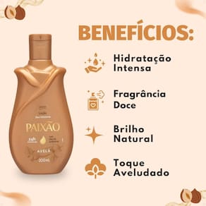 Sinta a delicadeza da avelã acariciando sua pele, enquanto a fórmula nutritiva da Loção Hidratante Paixão Avelã age profundamente, restaurando a hidratação natural e combatendo o ressecamento. Desfrute de uma pele visivelmente mais saudável, luminosa e com um toque sedoso que você vai amar.