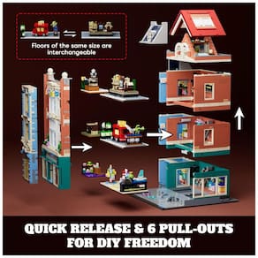 A estrutura frontal pode ser removida para converter o modelo em uma casa de bonecas aberta, com acesso integral ao interior. Os seis níveis internos são modulares e destacáveis, permitindo reorganizar andares e expositores com base em prateleiras com pinos para fixação de peças.?