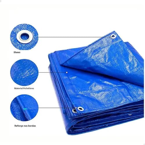10 metros quadrados no total Lona 75g/m em 100% polietileno medida 5x3 azul com ilhoses metálicas a cada 1 metro. Indicado para agricultura, construção civil, náutica, camping, pesca, recreação, utilidades domésticas, piscinas entre outros.