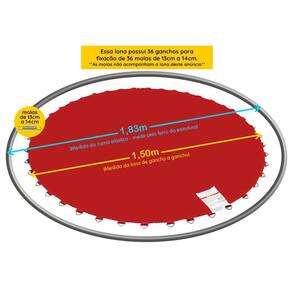 Essa Lona de Salto possui 1,50m de diâmetro e já vem com 36 ganchos fixados para molas de 13cm a 14cm. Portanto: