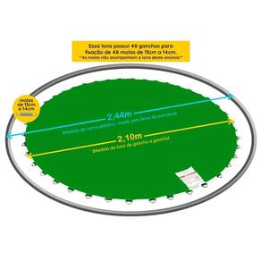 Essa Lona de Salto possui 2,10m de diâmetro e já vem com ganchos fixados para 48 molas de 13cm a 14cm. Portanto: