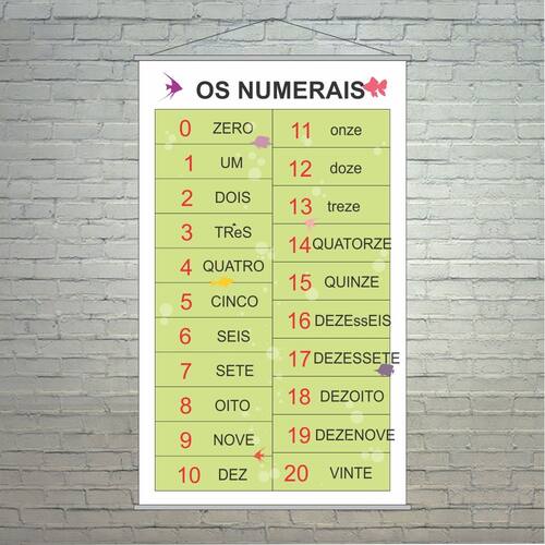 Com imagens de alta resolução de impressão, o Banner Os Numerais 0 a 20 Pedagógico Escolar 50x80 possui acabamento com bastões e corda, pronto para ser pendurado em qualquer ambiente.