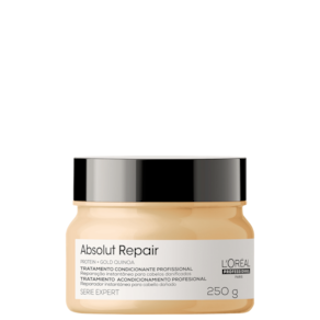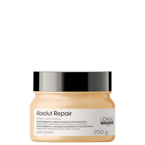 Máscara de tratamento para cabelos danificados. L'Oréal Professionnel Serie Expert Absolut Repair Gold Quinoa + Protein faz uma restauração completa nos fios, devolvendo a saúde e brilho do cabelo.