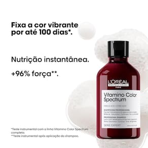 Vitamino Color Spectrum Shampoo Profissional De L'Oréal Professionnel, Formulado Com Ácido Ferúlico + Ácido Cítrico. A Tecnologia Ajuda A Fixar Os Pigmentos Na Fibra Capilar Para Fixar A Cor Vibrante Do Dia 1 Por Até 100 Dias. Resultados Em 5 Dimensões Da Cor:1. Brilho: Brilho Espelhado Ultraintenso . 2. Saturação: Cores Ricas E Vibrantes. 3. Contraste: Percepção Ideal Entre Múltiplos Tons. 4. Tom: Reflexos Indesejados Neutralizados. 5. Luminosidade: Níveis De Luminosidade E Profundidade São Bem Preservados. A Fórmula Ultra Hidratante Cria Uma Espuma Densa Que Limpa A Fibra Capilar Completamente Para Um Cabelo Instantaneamente Nutrido E Mais Forte. Teste Instrumental Com A Linha Completa Vitamino Color Spectrum Teste Instrumental Com A Linha Completa Vitamino Color Spectrum Após 4 Semanas. itens Inclusos:1- L'Oréal Profissional Vitamino Spectrum Shampoo 300ml. Marca: Não Informado