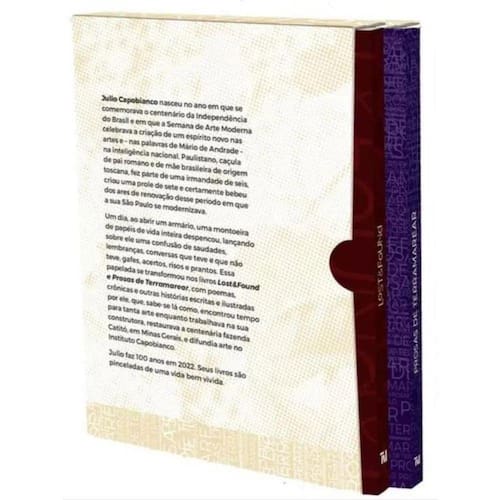 Lost & Found: Se partirmos da premissa de que nenhuma história é original, de que todas já foram vividas e contadas, então, estes poemas e crônicas de Lost&Found falam de nós. Estão aqui os amores, sonhos, conquistas e situações cotidianas vividas por um homem capaz de transformar o experimentado em literatura e pintura, de tornar a vida, arte. Ao organizar o passado como alguém que separa relíquias entre coisas acumuladas, Julio Capobianco constrói sua própria mítica, num texto elegante, contemplativo e convidativo, como numa deliciosa prosa mineira. Suas reflexões diante da superfície em branco da tela do computador ou da tela de pintura revelam um mundo interior rico em experiências e referências, na busca daquilo que lhe é extraordinário, daquilo que pode estar numa velha capa da Playboy de 1953 ou numa aula de latim do antigo ginásio. Prosas de terramarear: Este livro se completa com Lost&Found, mas pode ser lido separadamente. O autor volta às suas reminiscências em diferentes cenários e contextos: a praia na paulista Itanhaém, a fazenda na mineira Catitó, a desvairada capital paulista... num humor elegante e um texto menos contemplativo. Neste volume, há mais ação, mais personagens. Capobianco também empresta histórias de terceiros, de homens e mulheres com quem convive e conviveu, e dos quais extraiu memórias e conversas saborosas. Prosas de Terramarear é um convite para uma conversa de alpendre, com café e garoa, onde Capobianco nos recebe para desfiar seu inventário de memórias vividas ou imaginadas. Diz ele: Fico sempre nas minhas eternas dúvidas: pensei colecionar os escritos do dia a dia à medida que as coisas acontecem, ou que só acontecem na minha cabeça, sem importância do que sejam ou se serão lidos algum dia. Claro que não seria meu querido diário. Poderia ser um semanário, um anuário sabe-se lá qual será minha constância ou vontade. Só me interessa que não seja um obituário