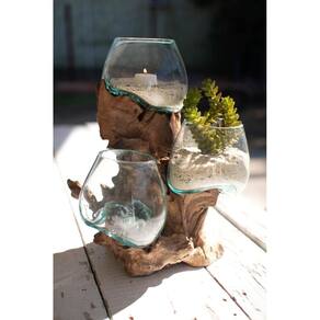 KALALOU DWA1007 Três taças de vidro soprado em uma base de madeira flutuante. Acabamento: Natural. Cor: Marrom. Material: vidro/madeira. Construção: Feito à mão. Dimensão (pol.): 13 (L) x 11 (L) x 15 (A). Limpe com um pano sem fiapos.