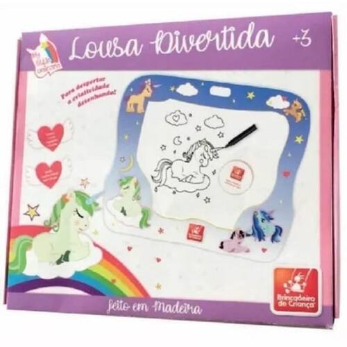 Lousa branca divertida unicórnio da marca Brincadeira de criança. Para despertar a criatividade desenhando Contém: 1 Lousa, 1 Apagador, 1 Canetão e 1 Quebra-Cabeça com 18 peças. Fabricado em madeira. Informações Básicas: Marca: Brincadeira de criança Ref: 0916 Idade Recomendada: Acima de 4 anos Dimensões da embalagem: 50 X 43 X 4 cm Código de Barras: 7898945400916 Contém: 1 lousa, 1 apagador, 1 canetão, 1 quebra cabeã 18 peças INMETRO CE-BRI/OCP - N 00013-01 NM 300/2002 Garantia: Contra Defeitos de Fabricação Todas as informações divulgadas são de responsabilidade do fabricante/fornecedor. Imagens Meramente Ilustrativas. Observe atentamente a idade recomendada para o brinquedo. Pode conter partes pequenas que podem ser engolidas e perigosas. Ean: 7898945400916