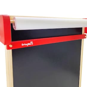 A Lousa Infantil de Parede modelo 085 da Brinqmutti, acompanha 1 quadro negro com detalhes na cor vermelha, 1 bobina de papel com 10 metros, 4 gizes coloridos, 1 apagador e 2 parafusos com buchas para fixação.