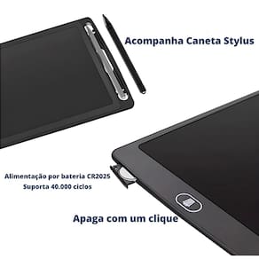Seja para desenhar, praticar caligrafia, fazer anotações rápidas ou até mesmo para comunicação, a Lousa Mágica é perfeita para todas as idades. É uma ferramenta indispensável tanto para o aprendizado infantil quanto para o dia a dia de adultos. Acompanha uma caneta especialmente projetada para uso na tela LCD. Sem tinta, sem bagunça, sem necessidade de substituições constantes. Com apenas um toque de botão, tudo o que foi escrito ou desenhado é apagado instantaneamente, proporcionando uma experiência mágica e prática. Ideal para crianças que adoram desenhar repetidamente sem desperdício de papel. Contribua para a preservação do meio ambiente. Nossa Lousa Mágica elimina a necessidade de papel, ajudando a reduzir o desperdício e promovendo uma alternativa sustentável. Leve, fina e resistente, esta lousa é fácil de transportar, podendo ser usada em qualquer lugar – na escola, no escritório, em casa ou em viagens. Sem necessidade de configurações complicadas. Basta começar a escrever ou desenhar assim que tirar da embalagem. Especificações Ténicas: Cor: Preto; Painel: LCD Flexível; Itens Inclusos: - 1x Lousa Mágica 12" - 1x Caneta sem Tinta; - 1x Bateria de 3v. ATENÇÃO: - Não recomendável para crianças de 03 anos por conter partes pequenas que podem ser engolidas ou aspiradas; - Evite a exposição prolongada do produto a luz ultravioleta, não molhe e nem deixe pingar qualquer liquido. Marca: NewIon