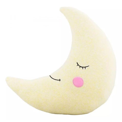 Tecido de pelúcia no formato de uma lua amarela com rosto de 33 x 11 x 30 cm de dimensão. Material: poliéster; Enchimento: fibra de poliéster; Produto certificado por Órgão acreditado pela CGCRE do INMETRO