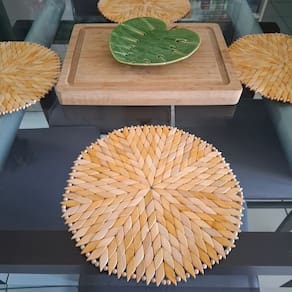 Este lugar americano redondo é uma peça única, feita por artesãos do Estado do Ceará, Brasil. Ele é confeccionado a partir de madeira de alta qualidade, garantindo durabilidade e resistência ao uso diário. As pecinhas de madeira envernizadas acrescentam um toque extra de elegância e sofisticação ao produto.