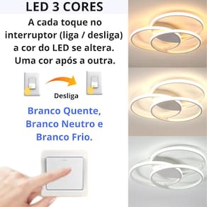 Luminária 3 Anéis LED 24 Watts Arandela Plafon Teto Parede Gimpo KJGD-398 COR: BRANCO 1 x Luminária 3 Anéis LED 24 Watts Arandela Plafon Teto Parede Gimpo KJGD-398. Branco quente 3000k, branco neutro 4500k e branco frio 6000k. LED Multitemperatura 3x1. Medidas: 26x24x8cm. Bivolt 110v/220v . Transforme seu espaço com elegância com a luminária LED 24 Watts Gimpo KJGD-398. A escolha perfeita para iluminar e modernizar qualquer ambiente com um toque minimalista. Combina materiais de alta qualidade, como o alumínio e silicone, e, formada por 3 anéis com LED, cada um com 17cm de diâmetro, propicia uma iluminação perfeita e aconchegante. Pode ser instalada na parede, como uma arandela, ou então, no teto. Um conceito versátil para uma variedade de ambientes. Já vem com LED multitemperatura instalado, pronto para uso, com 3 intensidades de cores: branco quente 3000K , branco neutro 4500K e branco frio 6000K . A seleção das luzes é feita através do . Ao acender e apagar a luz liga / desliga é possível alternar entre os três tons de luz. Isto faz com que a cor do LED seja alterada, uma cor após a outra. Deste modo, controla-se a luminosidade e também a potência de Watts que é enviada para o LED, além da atmosfera certa, a qualquer momento, para refletir as mais diferentes emoções. É compatível com tensão Bivolt, o que permite ligar em 110v e em 220v. LED e driver já seguem instalados, com rabicho pronto para adaptação na corrente elétrica. Ainda, para maior comodidade e praticidade, acompanha kit fixação com travessa, parafusos, buchas e arruelas. É uma luminária completa, com excelente luminosidade, prática e fácil de instalar em diversos ambientes, tais como: salas de estar, halls, corredores, banheiros, lavabos, cozinha, quartos, salas de jantar, bares, cafés, restaurantes, clínicas, etc. Pode ser utilizado individualmente ou em composições com outras luminárias. Ilumine seus momentos com estilo, requinte, modernidade e sofisticação Luminárias Gimpo. Elementos de beleza que complementam qualquer decoração. Especificações: 1 x Luminária Gimpo KJGD-398. Medidas luminária: 26cm largura x 24cm comprimento x 8cm profundidade. Base canopla : 7cm largura x 5cm comprimento x 2cm profundidade. Base de sobrepor. Cor da base: mesmo tom de cor da luminária. Fita de LED já instalada. Potência: 24 Watts. LED Driver 3 Cores. Com proteção contra curto-circuito. Instalação: Corrente elétrica. Fiação rabicho já instalado no driver. Material: Alumínio, Silicone e Ferro. Voltagem: 110v / 220v Bivolt . Acompanha kit parafusos, buchas, arruelas e travessa. Necessita montagem: fixação da base e ligação na corrente elétrica. Medidas da caixa: 28cm x 27cm x 9cm. Peso: 650 gramas. Modelo: KJGD-398. Marca: Gimpo. Sempre verifique a cor do produto ANTES de concluir a compra. Não fazemos alterações posteriores em pedidos. Imagens do anúncio são ilustrativas.