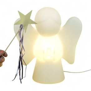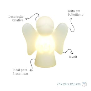 Instruções: Aceita alguns tamanhos de lâmpada LED, que passem pela abertura.A Luminária Anjinho é perfeita para quem busca uma iluminação suave e um toque de carinho na decoração. Seu design delicado transmite paz e aconchego, tornando-a ideal para o quarto das crianças, ambientes de descanso ou para compor uma linda decoração natalina.