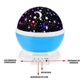Funções dos botões Botão a - liga e desliga Botão b - troca cores de luz Botão c - efeito giratório Tampa semi-transparente podendo usar a luminária com ou sem a tampa, fazendo o céu estrelado ou apenas usando como luminária. Tamanho: 10.8 x 9.5 x 9.5 centímetros