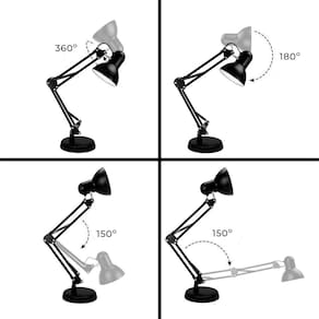 Desing, modernidade e conforto para a sua leitura A luminaria articulavel com base para mesa é ideal para você que estuda ou trabalha e preza por um ambiente mais iluminando. A luminária articulada de mesa vai lhe auxiliar, deixando o ambiente mais claro, favorecendo para a sua concentração e foco, e deixando também o ambiente com um visual mais moderno. A luminaria abajur de mesa é feita de um material de ótima qualidade e possui em sua estrutura articulações para que assim você possa dirigir o foco de luz para onde desejar. Ela é compatível com lâmpadas e27, possui um sistema bivolt e compacta. Algumas perguntas O que é luminaria articulada de mesa A luminaria articulada de mesa com base é um produto essencial para você ter em sua casa ou escritório. Ela é utilizada para auxiliar você durante os estudos, trabalho e suas leituras. Por que usar luminaria articulada de mesa A luminaria de mesa articulada ajuda a manter o foco e a concentração durante o trabalho ou estudo, pois é possível direcionar a luz para o local desejado. Ela possui bocal para lâmpadas e27, sendo compatível com lâmpadas de até 40 watts. Quais os benefícios de usar luminaria articulada de mesa A luminaria articulavel de mesa possui articulações que ajudam a movimentá-la e direcionar o a luz para onde preferir. Ela possui um corpo com altura máxima de até 68 cm auxiliando assim a luminosidade em um maior alcance. Características luminaria articulada de mesa - a luminaria articulada de mesa possui uma base estável que proporciona firmeza para a luminária - possui um bocal compatível com lâmpadas e27 - possui um de ligar/desligar, localizado na parte do fio que liga na tomada - tem um estilo clássico e material de boa qualidade - seu corpo pode ser esticado até 68 cm, aumentando assim a área de iluminação - sua base tem 15 cm de diâmetro, e sua cúpula tem de 12 cm de diâmetro. Especificações luminaria articulada de mesa Material: metal Voltagem: bivolt Lâmpadas: e27 de até 40 watts. Itens inclusos 1 luminaria articulada de mesa bivolt com base Obs: não acompanha a lâmpada Ean: 0709016976421
