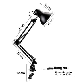 A luminaria abajur de mesa é feita de um material de ótima qualidade e possui em sua estrutura articulações para que assim você possa dirigir o foco de luz para onde desejar. Ela possui em sua base um clip ajustável com 4 molas e 3 juntas rotativas de metal, braço ajustado até 49,53cm de altura, permitindo assim que você a coloque onde quiser.