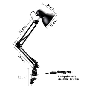 Desing, modernidade e conforto para a sua leituraA luminaria articulavel com clip ajustável para mesa é ideal para você que estuda ou trabalha e preza por um ambiente mais iluminando. A luminária articulada de mesa vai lhe auxiliar, deixando o ambiente mais claro, favorecendo para a sua concentração e foco, e deixando também o ambiente com um visual mais moderno.A luminaria abajur de mesa é feita de um material de ótima qualidade e possui em sua estrutura articulações para que assim você possa dirigir o foco de luz para onde desejar. Ela possui em sua base um clip ajustável com 4 molas e 3 juntas rotativas de metal, braço ajustado até 49,53cm de altura, permitindo assim que você a coloque onde quiser.Ela é compatível com lâmpadas e27, possui um sistema bivolt, é compacta e pode ser utilizada em suas viagens.Algumas perguntas O que é luminaria articulada de mesaA luminaria articulada de mesa com clip ajustável é um produto essencial para você ter em sua casa ou escritório. Ela é utilizada para auxiliar você durante os estudos, trabalho e suas leituras. Por que usar luminaria articulada de mesaA luminaria de mesa articulada é essencial para você que gosta de manter o foco e a concentração durante o trabalho ou estudo. Ela possui bocal para lâmpadas e27, sendo compatível com lâmpadas de até 40 watts.Quais os benefícios de usar luminaria articulada de mesaA luminaria articulavel de mesa possui articulações que ajudam a movimentá-la e direcionar a luz para onde preferir. Ela possui um corpo com altura máxima de até 68cm auxiliando assim a luminosidade em um maior alcance. Características luminaria articulada de mesa- a luminaria articulada de mesa possui um clip ajustável que pode ser fixado, proporcionando firmeza em qualquer local que for instalada- possui um bocal compatível com lâmpadas e27- possui um interruptor de ligar/desligar, localizado na parte do fio que liga na tomada- tem um estilo clássico e material de boa qualidade- seu corpo pode ser esticado até 68cm, aumentando assim a área de iluminação Especificações luminaria articulada de mesaMaterial: metalVoltagem: bivoltLâmpadas: e27 de até 40 wattsBase: clip articulávelItens inclusos1 luminaria articulada de mesa bivolt com clip ajustávelObs: não acompanha a lâmpada