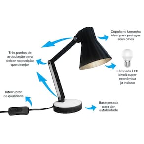 A luminária articulada de mesa é uma opção prática e eficiente para iluminar de forma adequada o ambiente de trabalho, estudo ou até para sua escrivaninha ao lado da cama. Com sua estrutura articulada, a luminária pode ser ajustada de acordo com a preferência do usuário, direcionando a luz para onde ela é necessária. Além disso, sua base é estável, proporcionando uma fixação segura e evitando que a luminária caia ou se mova.Porque é vantajoso usar essa luminária articulada como abajur ao lado da sua cama?A luminária articulada é uma excelente escolha para ser usada como abajur ao lado da cama, oferecendo diversas vantagens em relação aos abajures convencionais:Uma das principais vantagens é a flexibilidade de direcionamento da luz. Com sua estrutura articulada, a luminária pode ser facilmente ajustada para direcionar a luz em diferentes ângulos e intensidades, permitindo que o usuário possa personalizar a iluminação de acordo com suas preferências e necessidades. Isso é especialmente útil para quem gosta de ler ou trabalhar na cama antes de dormir, ou ainda para quem precisa de um ponto de luz para se orientar no quarto durante a noite.Outra vantagem é que essa luminária articulada de mesa é compacta e fácil de posicionar ao lado da cama ou na sua mesa de trabalho, ocupando menos espaço do que os abajures tradicionais.Economize na sua conta de luz!Outra vantagem importante é que essa luminária possui tecnologia LED, que consome menos energia elétrica em comparação com outras opções de iluminação. Isso significa que o uso de uma luminária de mesa pode ajudar a reduzir a conta de luz e os custos de energia, o que pode ser especialmente benéfico para quem busca economia em suas contas.Itens inclusos:1 x Luminária bivolt1 x Lâmpada LED bivolt