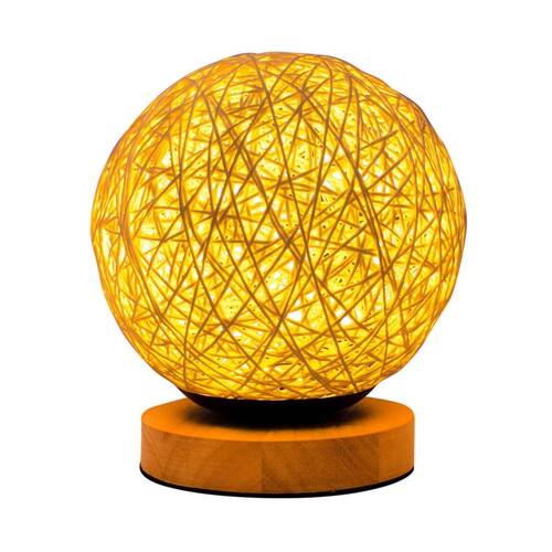 Luminária no formato de uma bola amarela em uma base de madeira com 18 cm de altura e 15 cm de diâmetro.