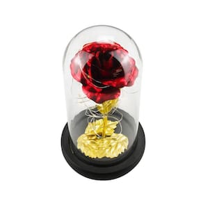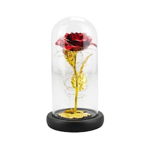 A luminária possui formato cilíndrico e vem decorada com uma rosa e folhas douradas ou na cor vermelha, além de uma base preta que proporciona estabilidade. O botão de liga e desliga é de fácil acesso, permitindo que você controle a iluminação de acordo com a sua preferência.