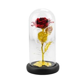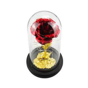 A luminária possui formato cilíndrico e vem decorada com uma rosa e folhas douradas ou na cor vermelha, além de uma base preta que proporciona estabilidade. O botão de liga e desliga é de fácil acesso, permitindo que você controle a iluminação de acordo com a sua preferência.