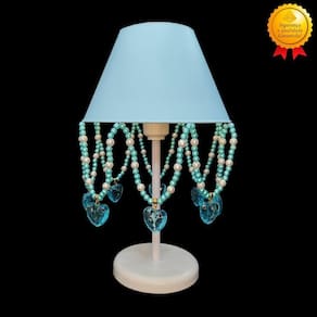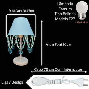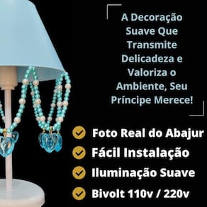 Artesanal, design moderno, ideal para decoração de quarto de crianças, bebê, ilumina muito bem e realça o ambiente. Especificações abajur: - cúpula de polipropileno plástico resistente na cor azul bebê; - base em acrílico branco; - haste de acrílico branco; - pingentes de coração azul, pérolas coloridas; - altura total do abajur 30 cm; - diâmetro maior da cúpula mede 17 cm; - soquete para lâmpadas modelo e-27 bivolt aceita lâmpadas 110v e 220v ; - usar lâmpada de no máximo 40w lâmpada não incluso ; - importante: imagens reais do produto, porém as cores dos pingentes e pérolas podem variar de acordo com cada produto fabricado, conforme disponibilidade Do atenção mamãe grande por tempo limitado Marca: Não Informado